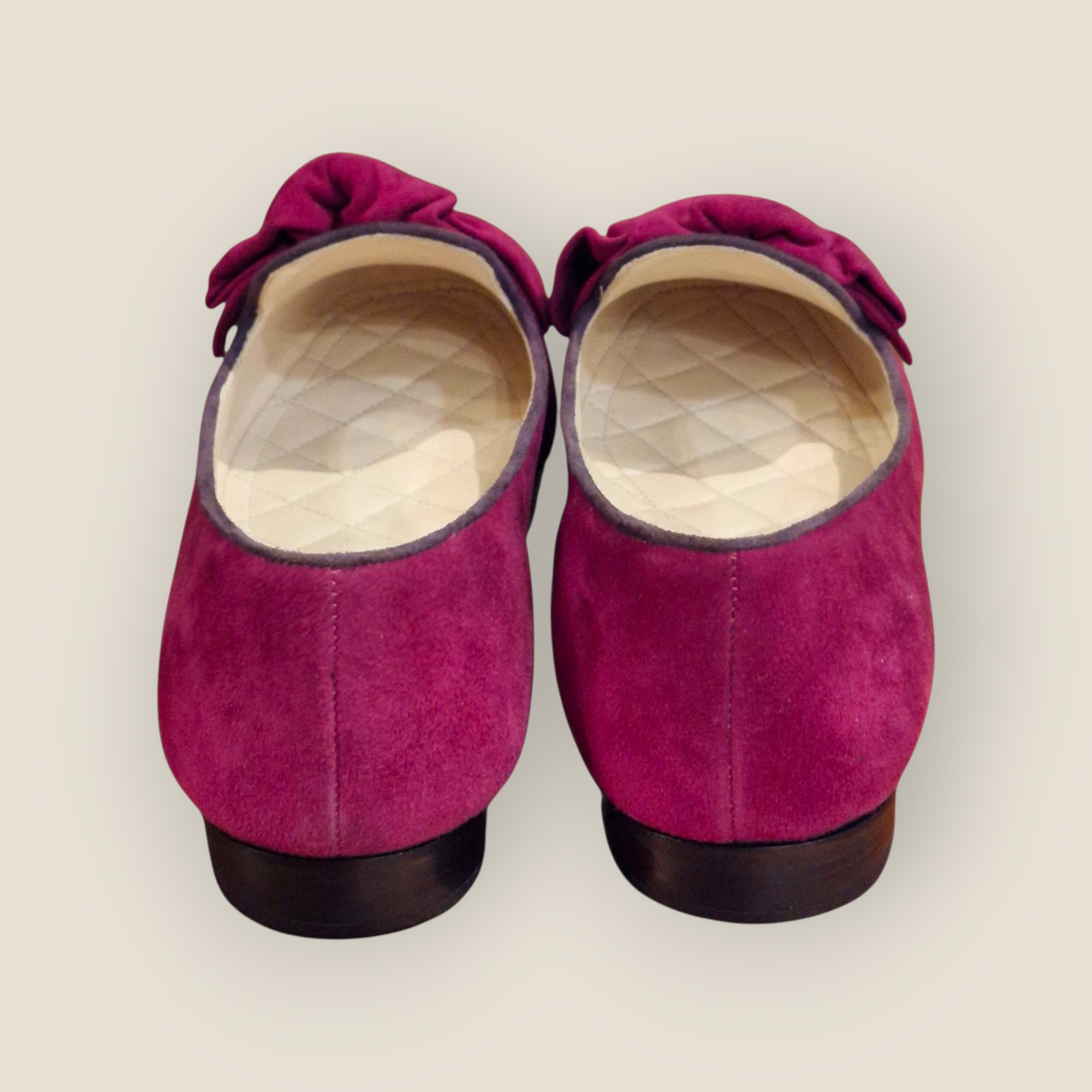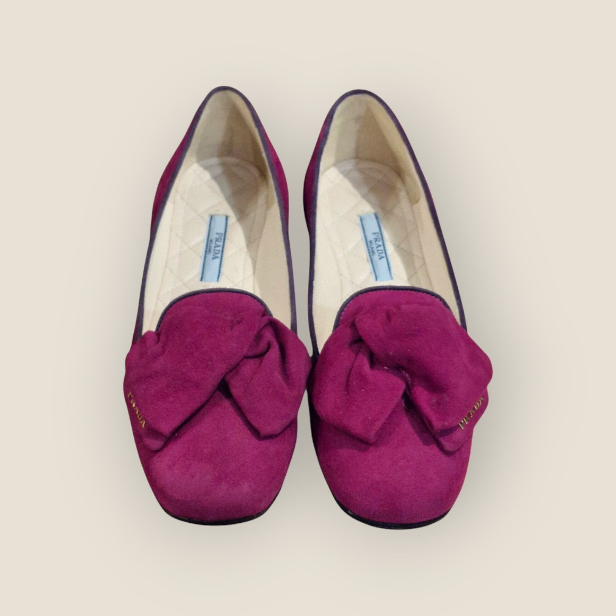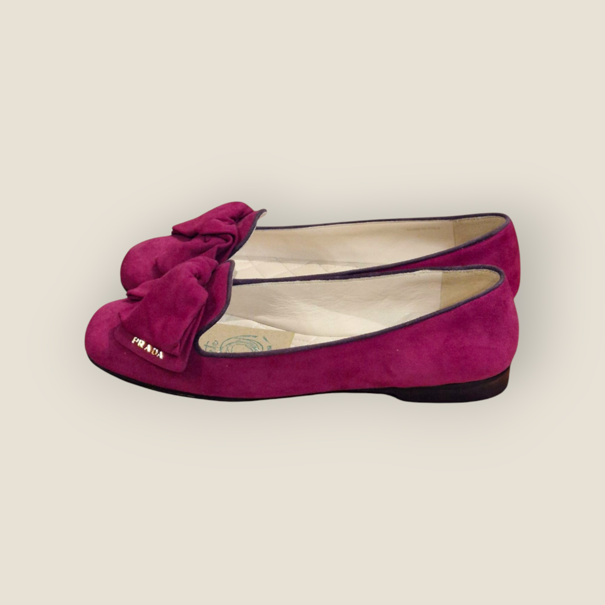 Bailarinas Prada confeccionadas en ante de tacto suave en tono fucsia intenso. Diseño clásico de punta redondeada con lazo frontal estructurado y detalle de logo metálico. Interior acolchado con plantilla capitoné que aporta mayor confort. Suela plana con refuerzo antideslizante. Un modelo elegante y versátil que combina color y sofisticación, ideal para elevar looks neutros o acompañar estilismos más expresivos. Incluye caja y funda guardapolvo.