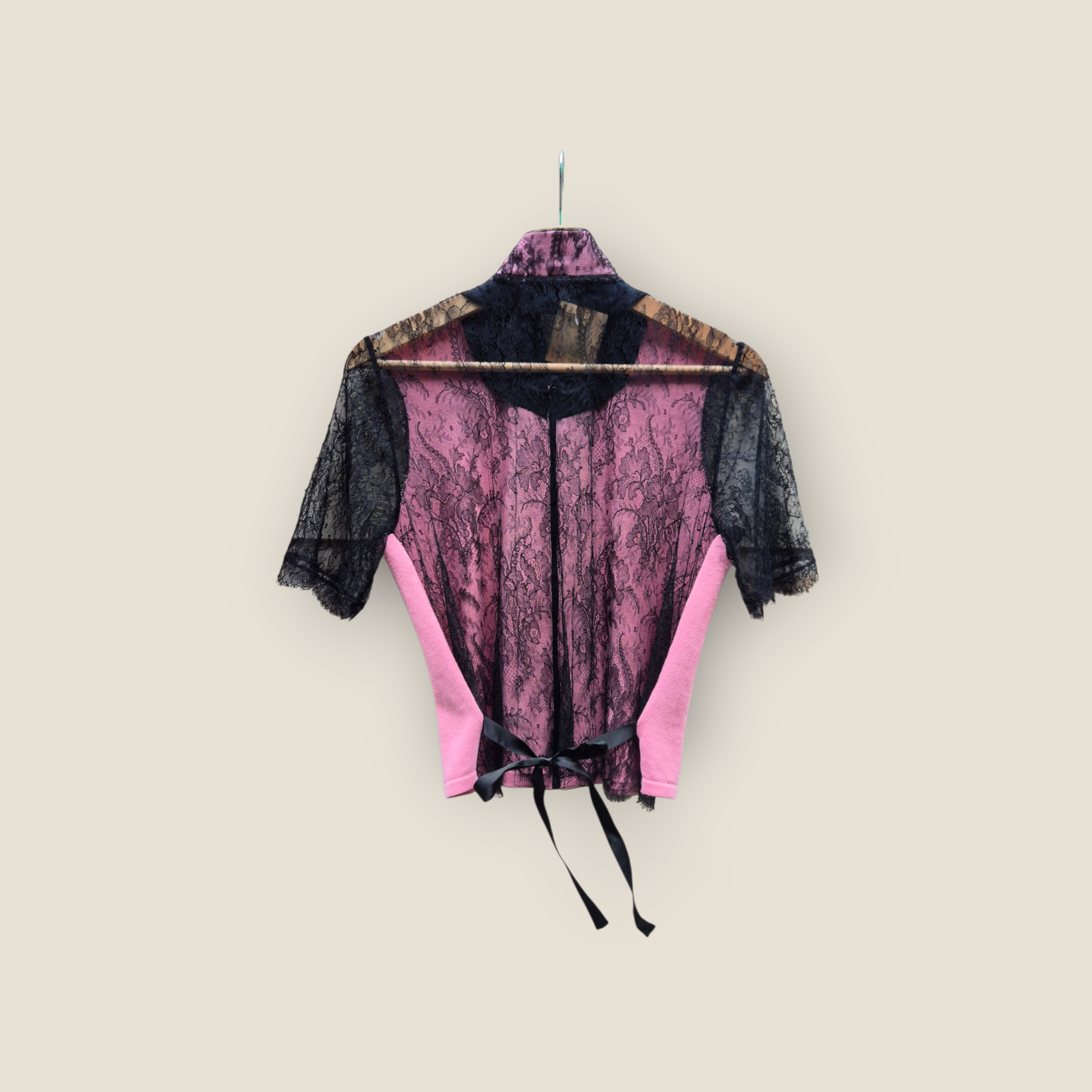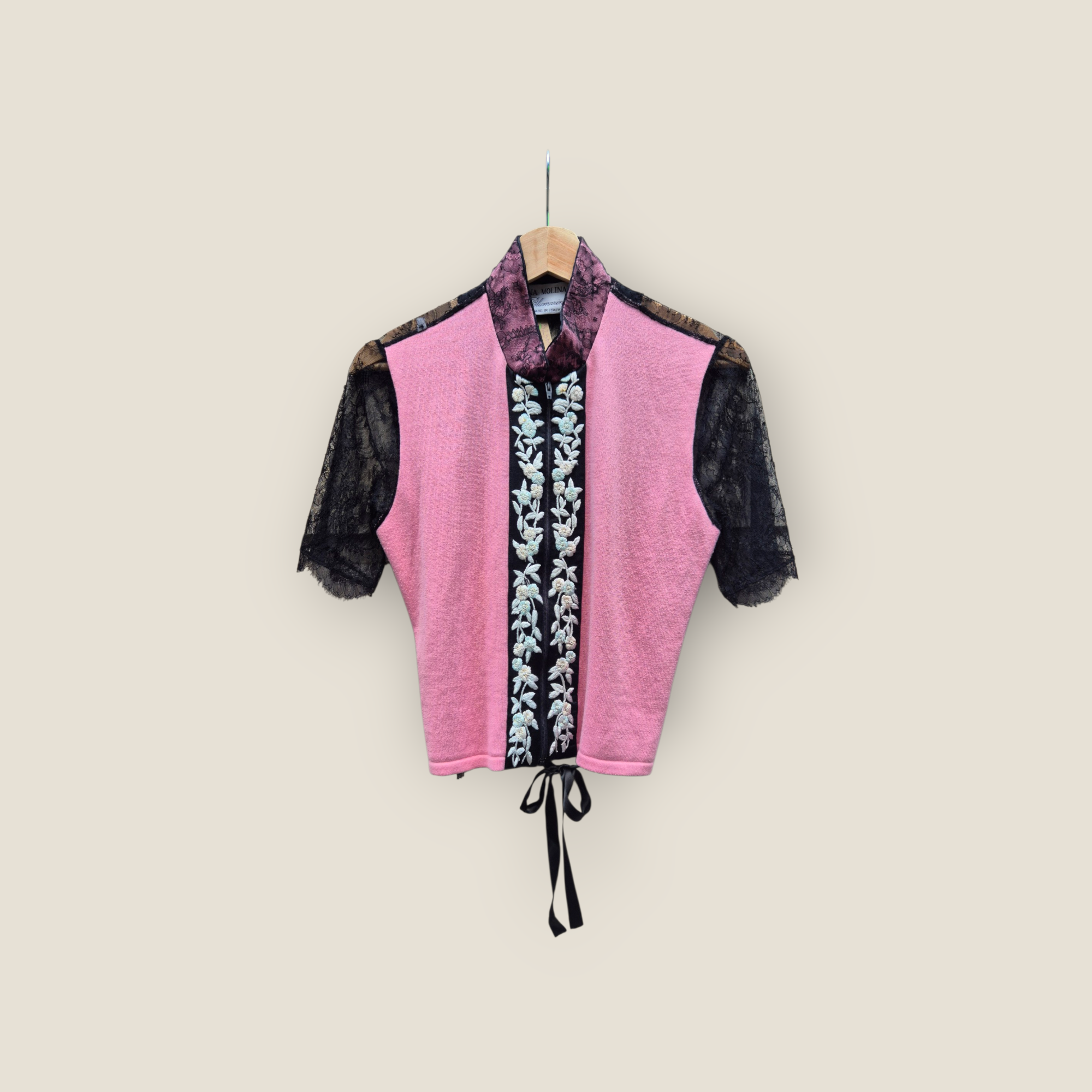 Prenda de Anna Molinari Blumarine confeccionada en combinación de punto de algodón y paneles de encaje floral semitransparente. Presenta cuerpo en tono rosa, mangas cortas y hombros en encaje negro, con pieza frontal en contraste negro decorada con bordado floral en relieve. Cuello alto suave en encaje y cierre frontal mediante cremallera. Diseño femenino y muy característico de la línea Blumarine, ideal como pieza especial de layering o protagonista.