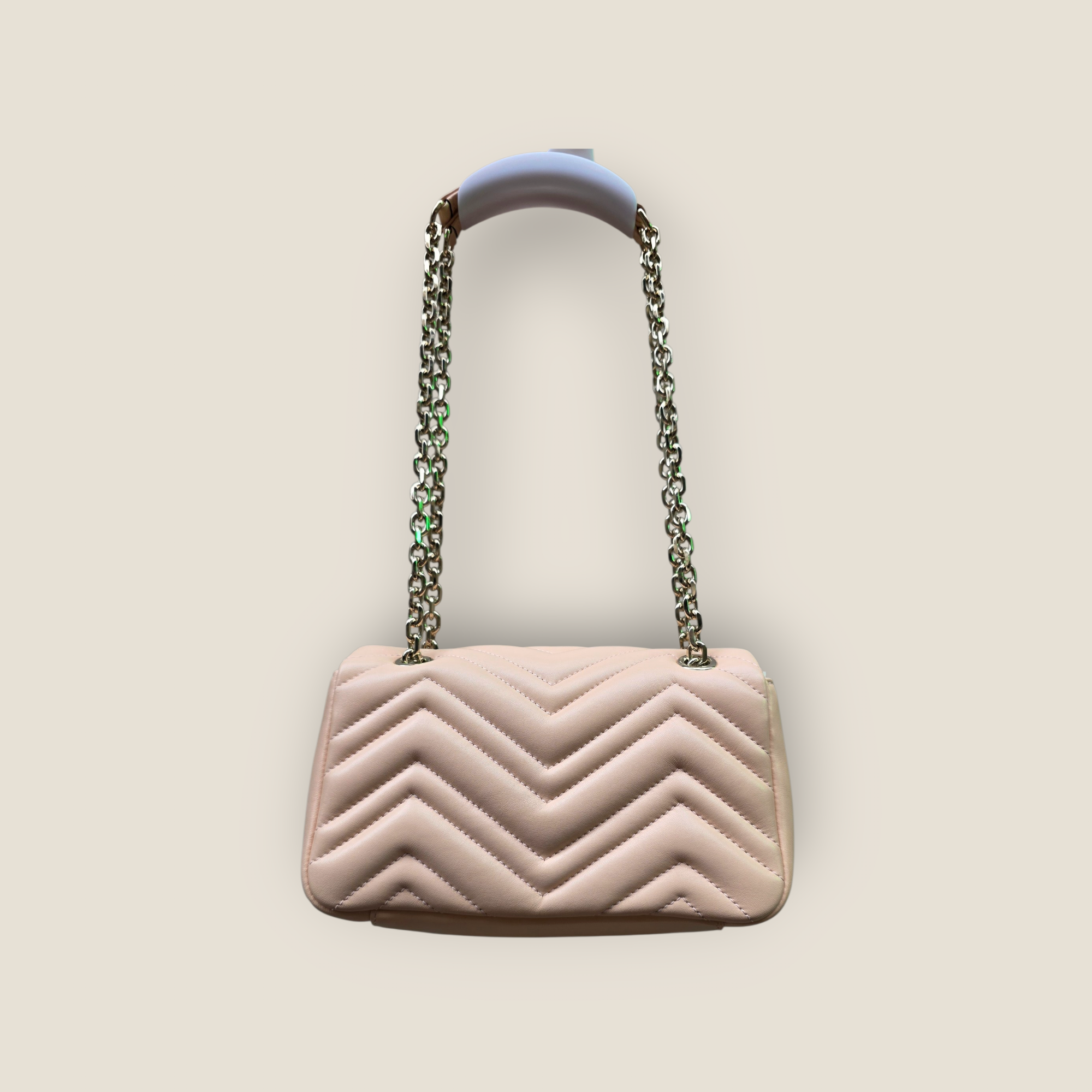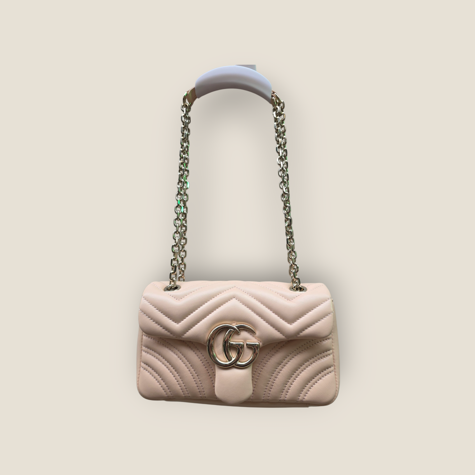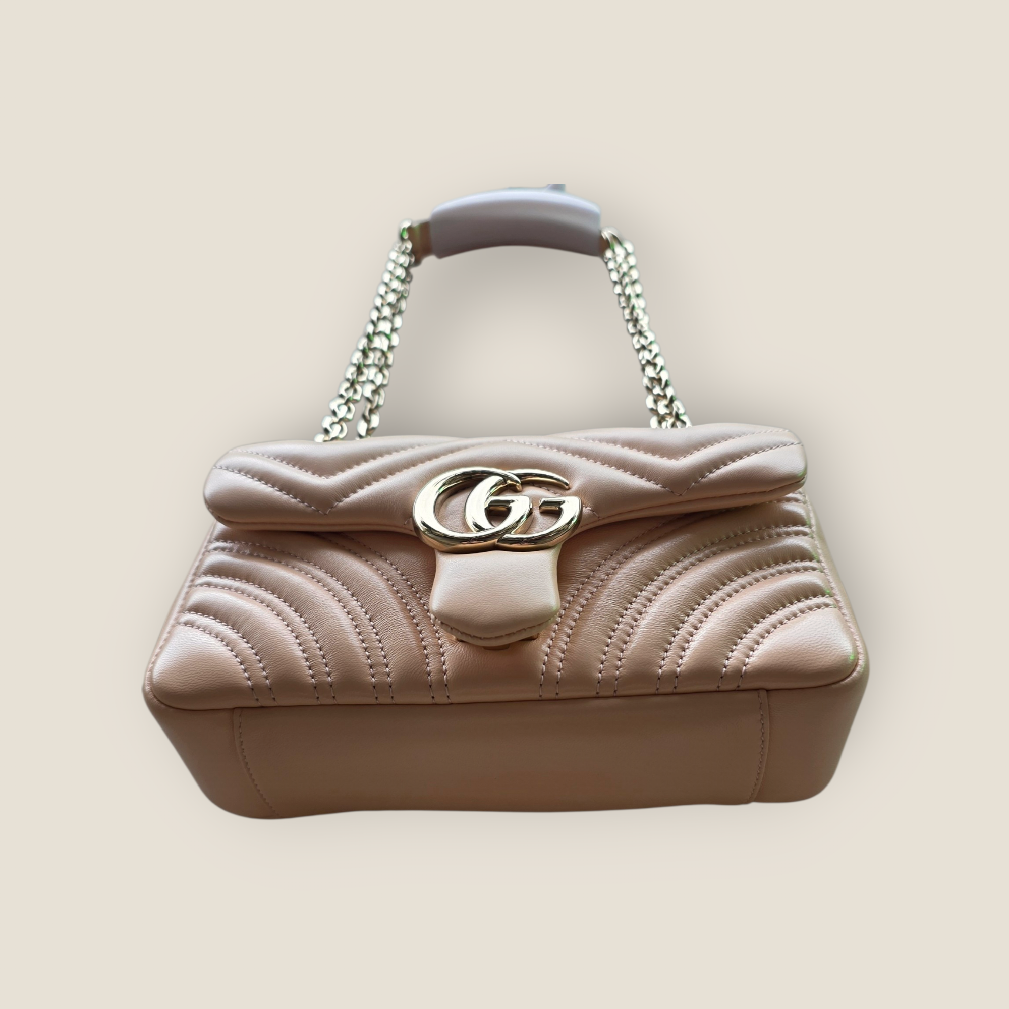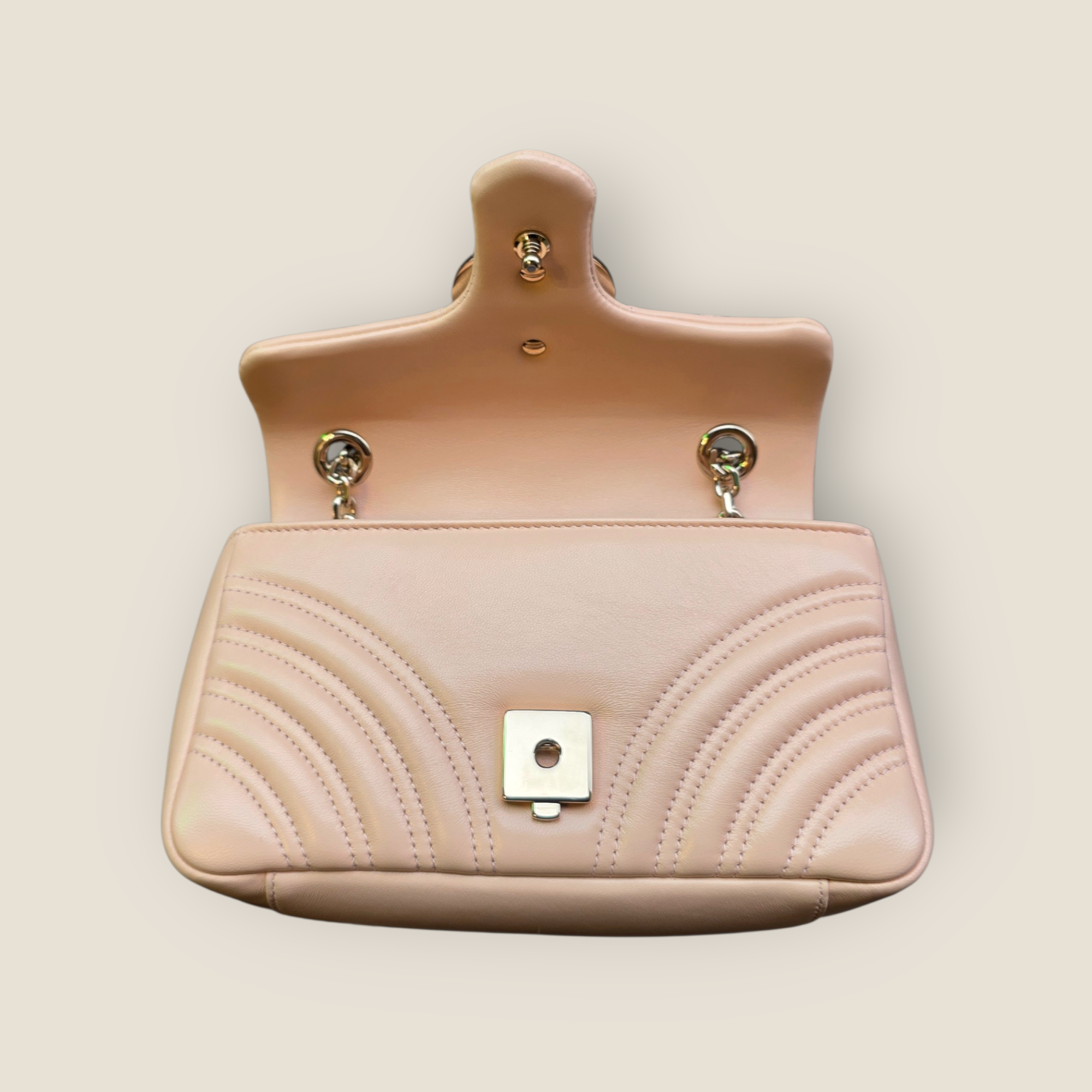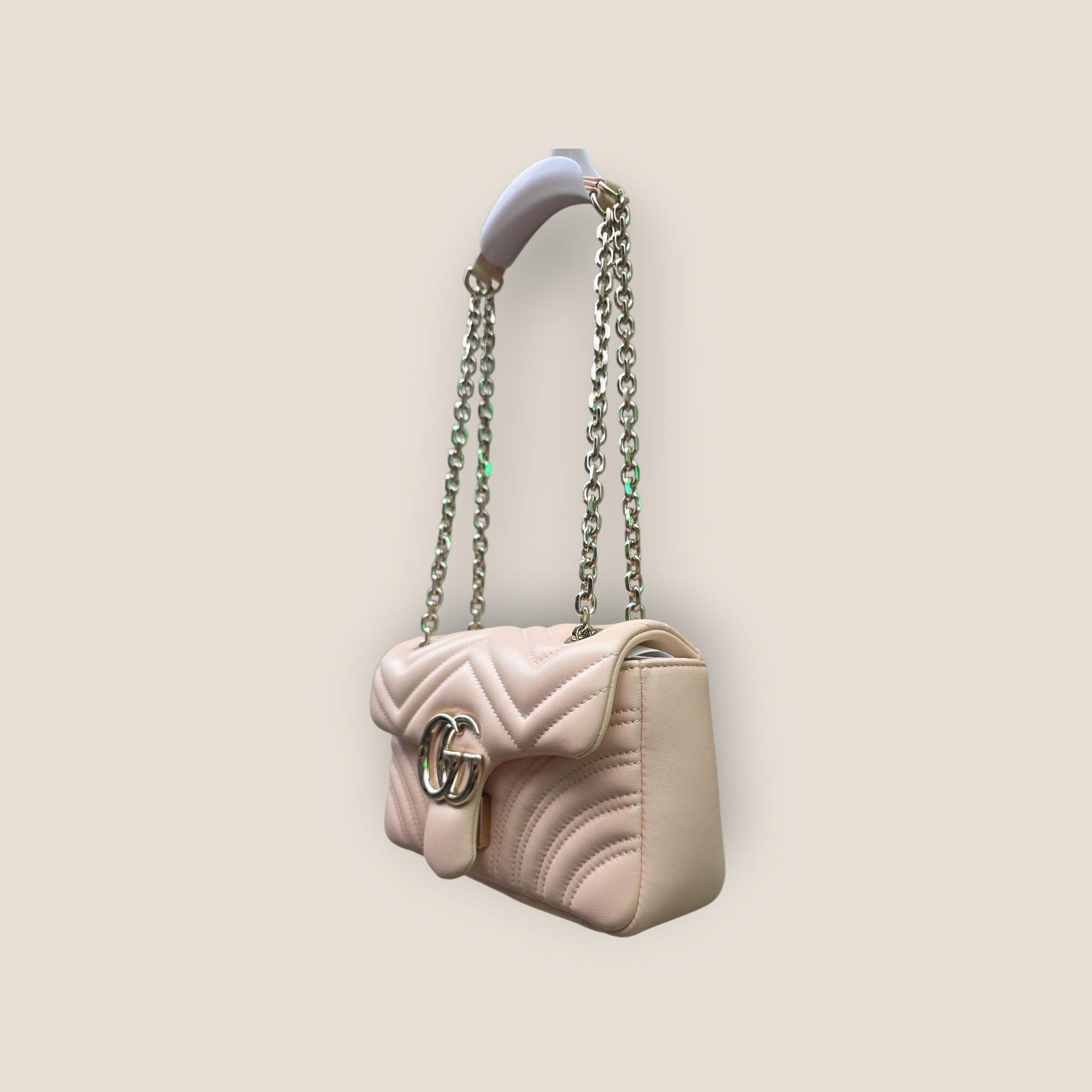 Bolso Gucci modelo GG Marmont Mini confeccionado en piel suave con acolchado matelassé en patrón chevron. Presenta el emblemático cierre frontal con el logotipo doble G en metal plateado, uno de los símbolos más reconocibles de la firma. La cadena metálica con hombrera de piel permite llevarlo cómodamente al hombro o cruzado. Su tamaño compacto lo convierte en un bolso perfecto tanto para el día como para la noche, combinando funcionalidad y elegancia contemporánea.