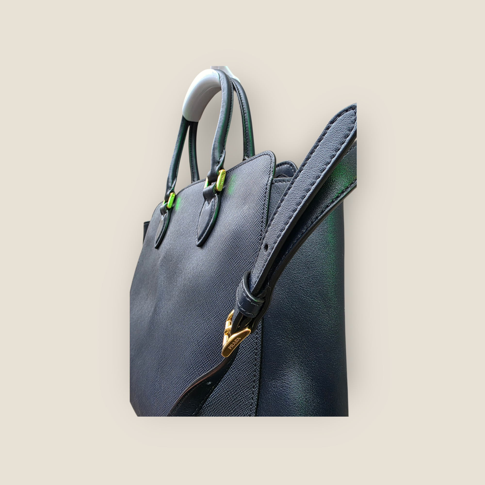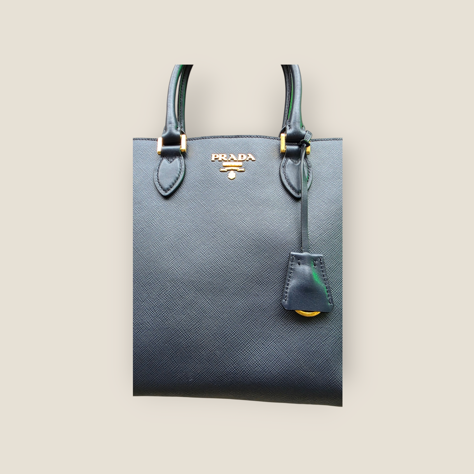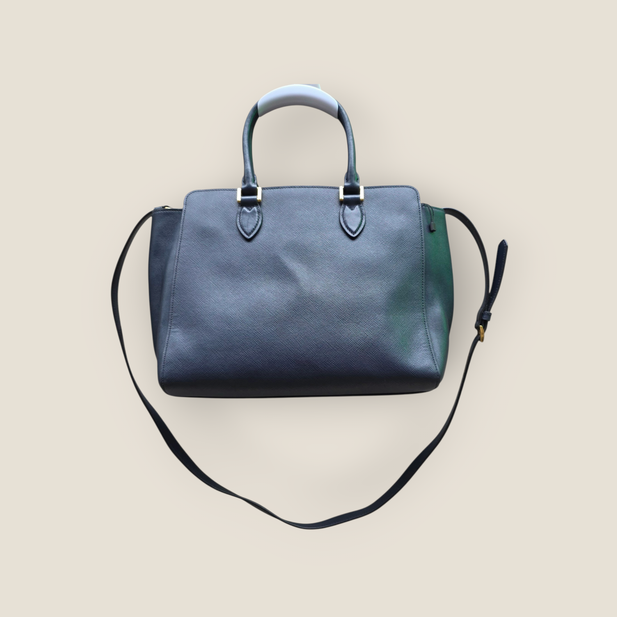 Bolso Prada modelo Galleria confeccionado en piel Saffiano de color azul marino, reconocible por su textura cruzada resistente y su acabado sofisticado. Presenta doble asa de mano y bandolera desmontable que permite llevarlo también al hombro o cruzado. El logotipo Prada en metal dorado en el frontal y los herrajes dorados aportan el sello distintivo de la casa italiana. Su diseño estructurado y espacioso lo convierte en una pieza elegante y práctica para el día a día.