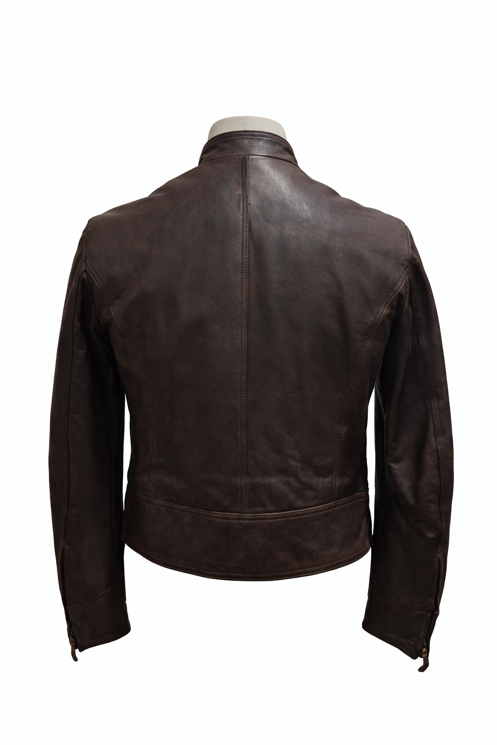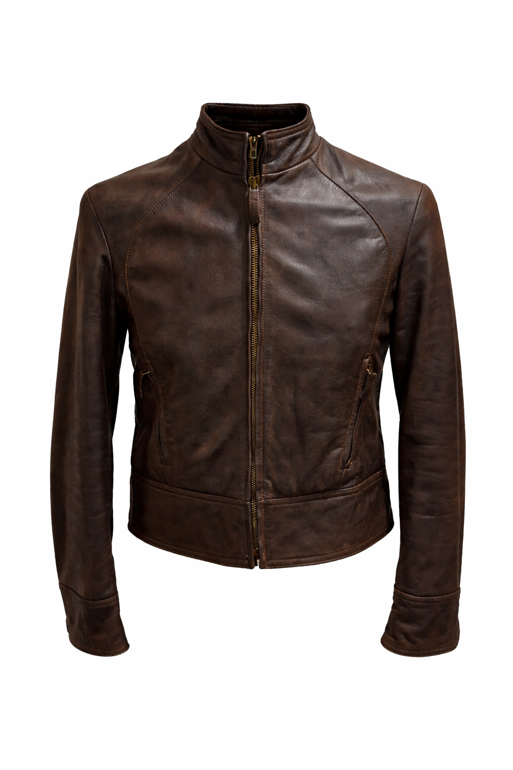 Cazadora de cuero de la firma Armani Jeans, seleccionada por la calidad de la piel y su diseño limpio de inspiración motociclista.