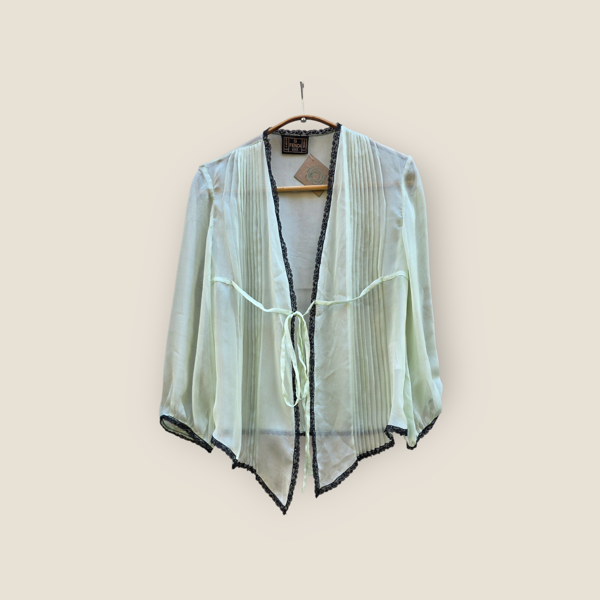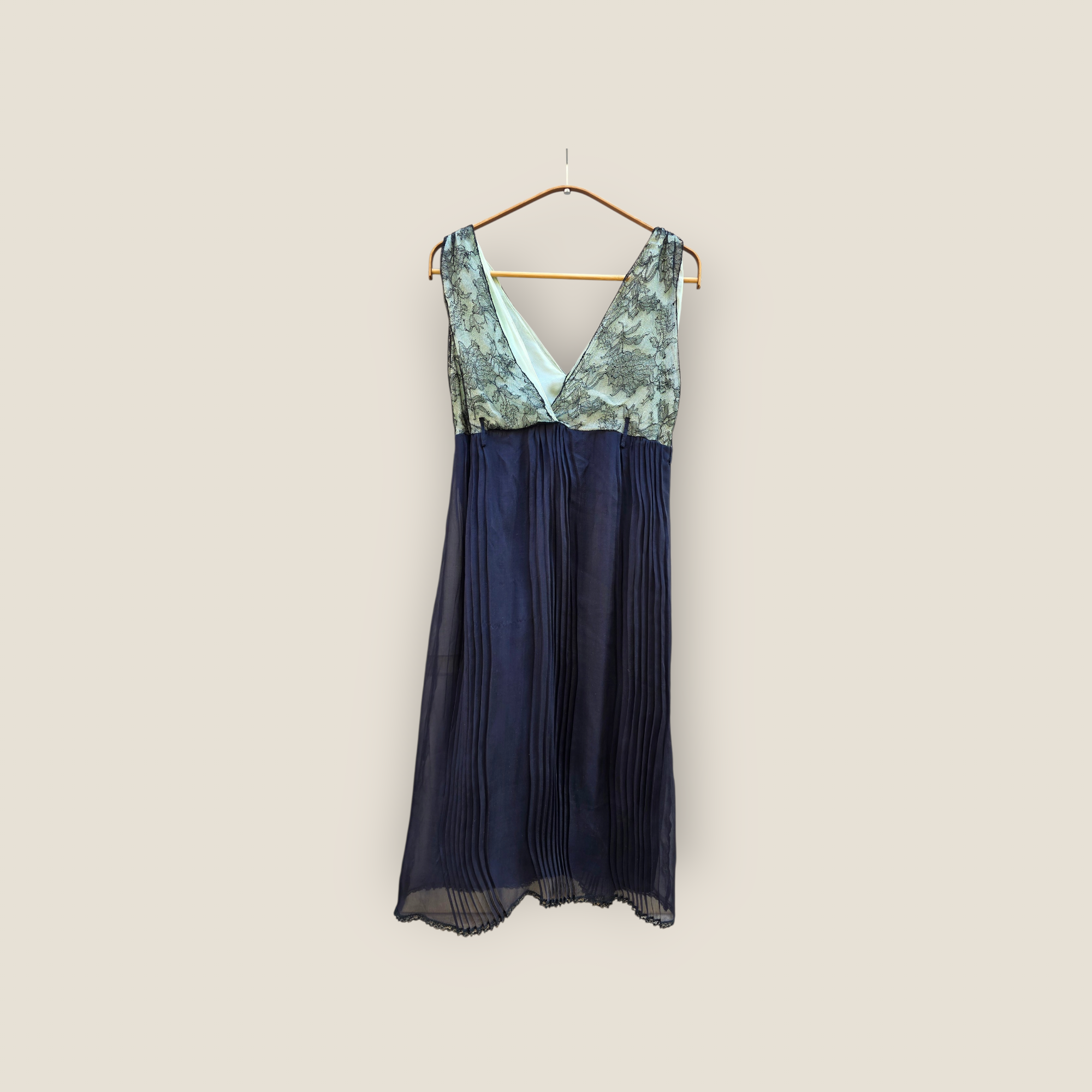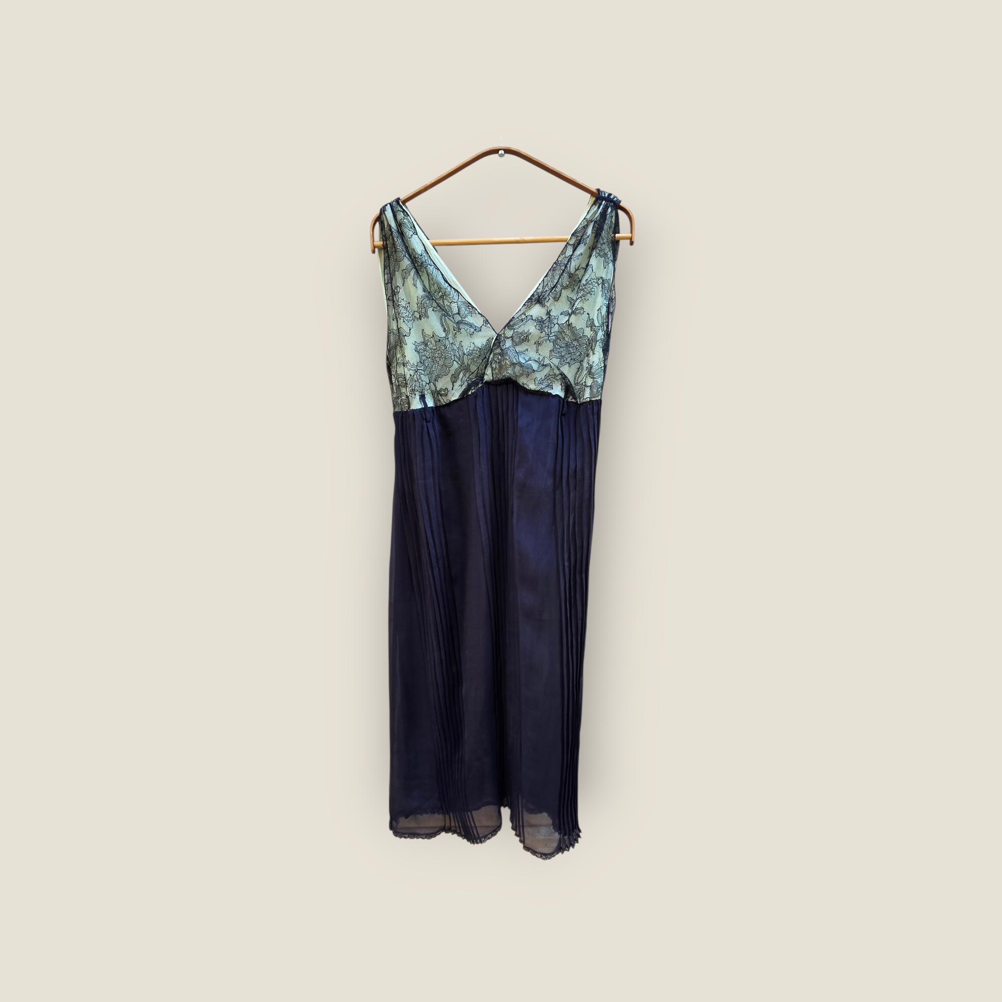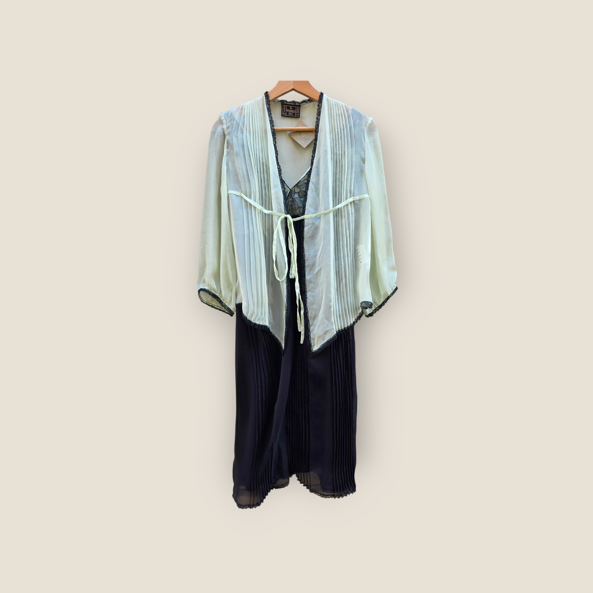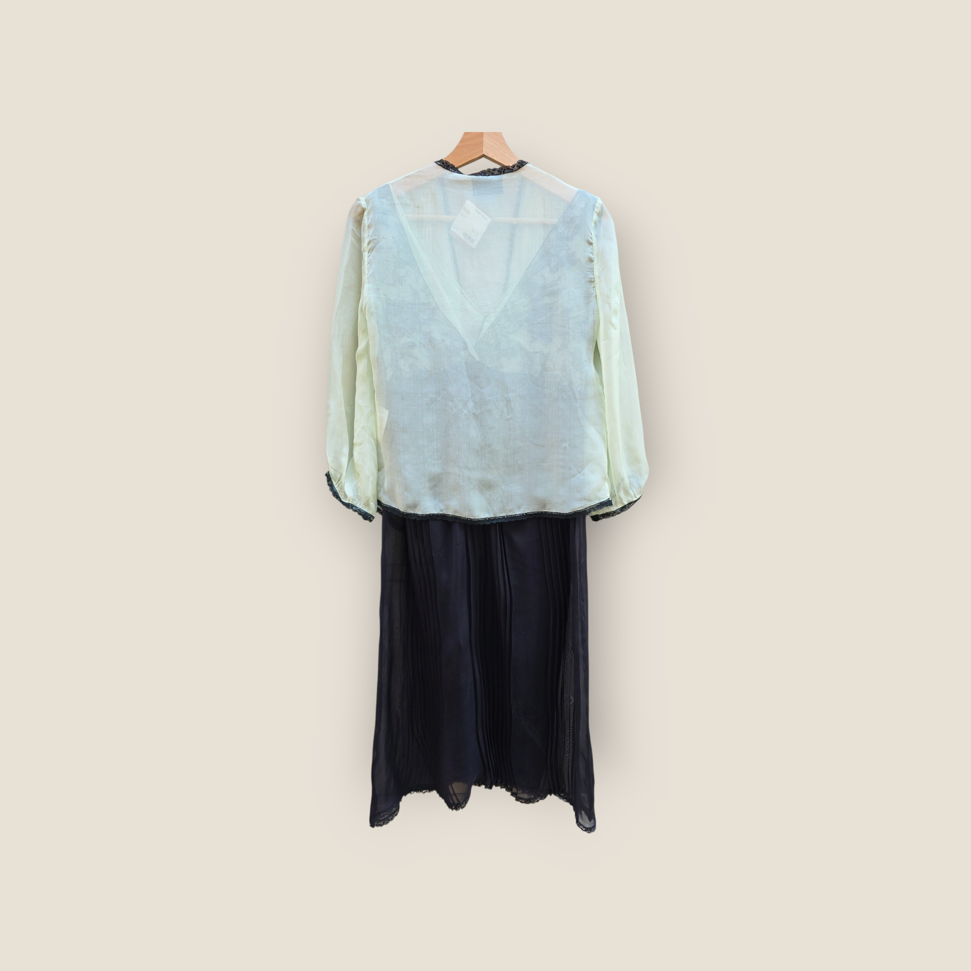 Conjunto de dos piezas Fendi compuesto por vestido de seda negra con falda plisada y top/chaqueta ligera en seda translúcida en tono marfil. El diseño destaca por sus acabados en encaje negro, escote en V y caída fluida que aporta movimiento y feminidad.