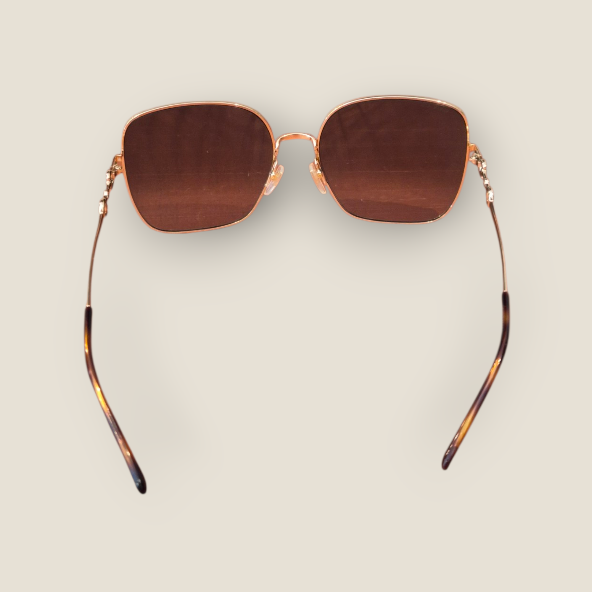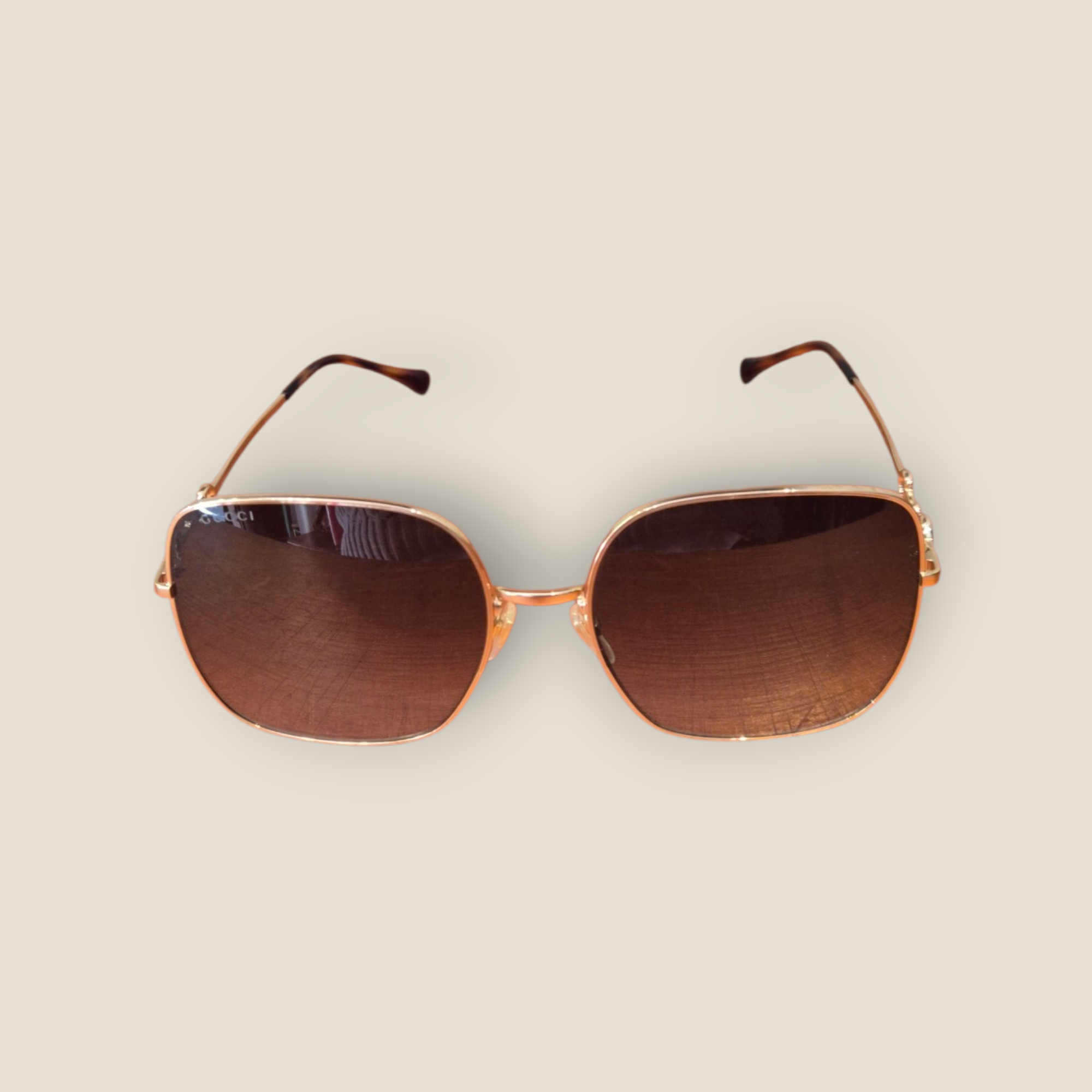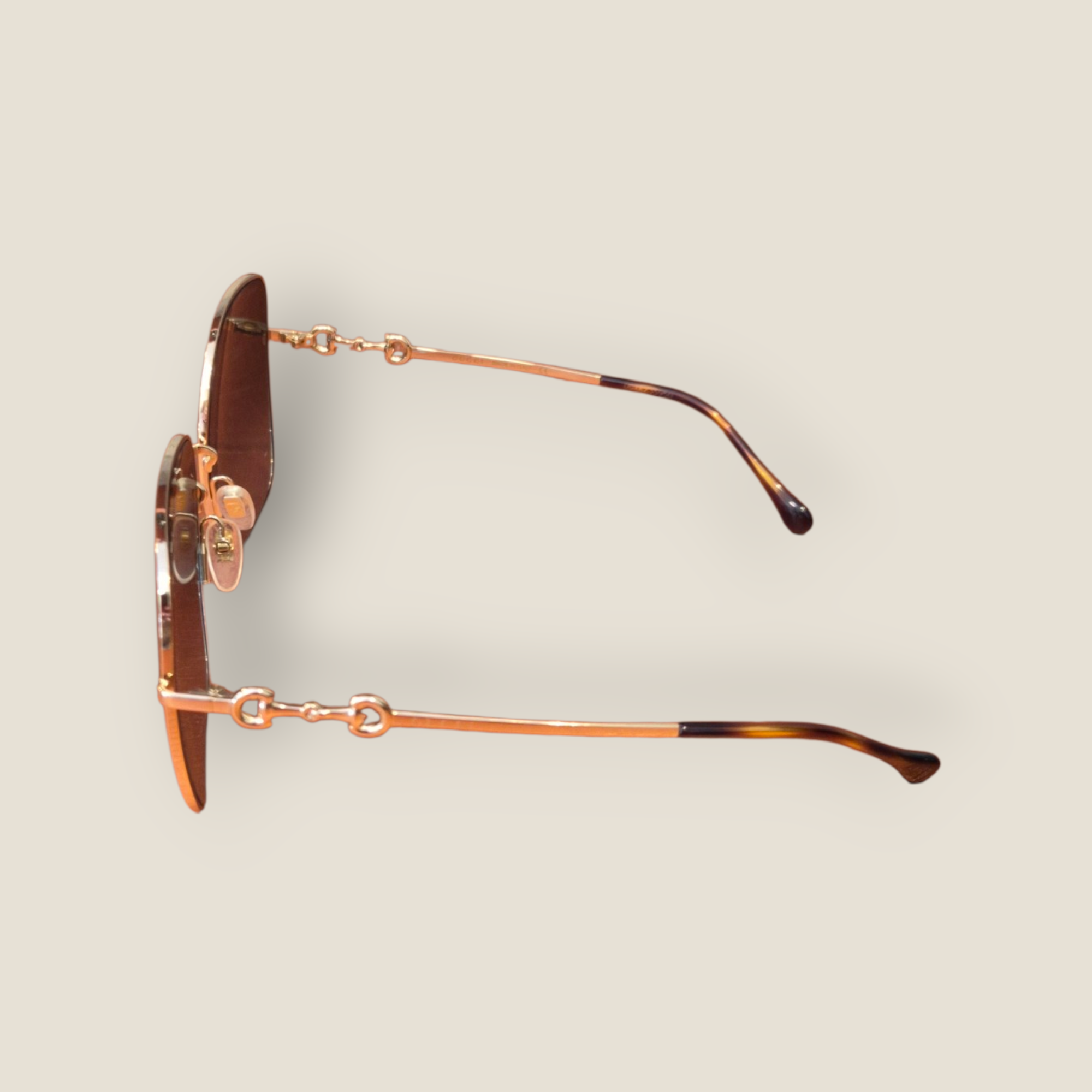 Gafas de sol Gucci con montura metálica en acabado dorado y forma rectangular suavizada. Destacan por el icónico detalle Horsebit en las varillas, inspirado en la herencia ecuestre de la casa. Lentes en tono verde degradado que aportan elegancia y protección solar. Diseño ligero y sofisticado, ideal para looks tanto clásicos como contemporáneos. Fabricadas en Italia.