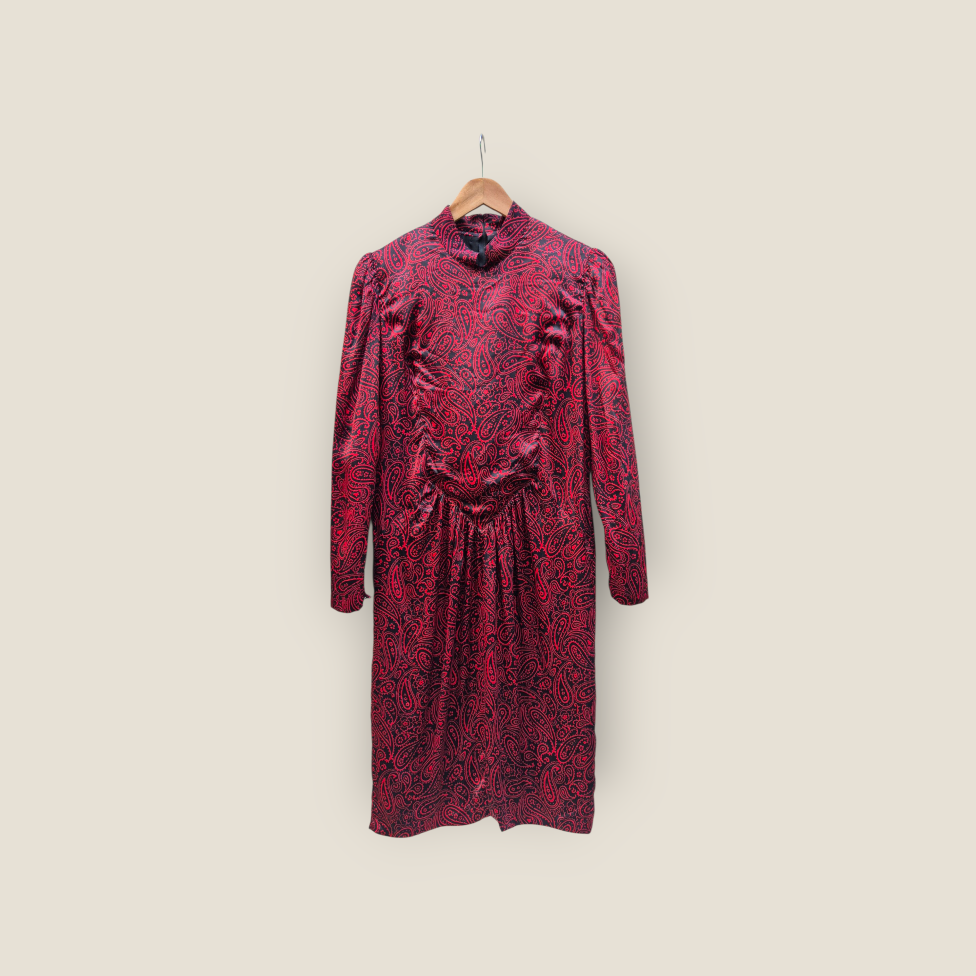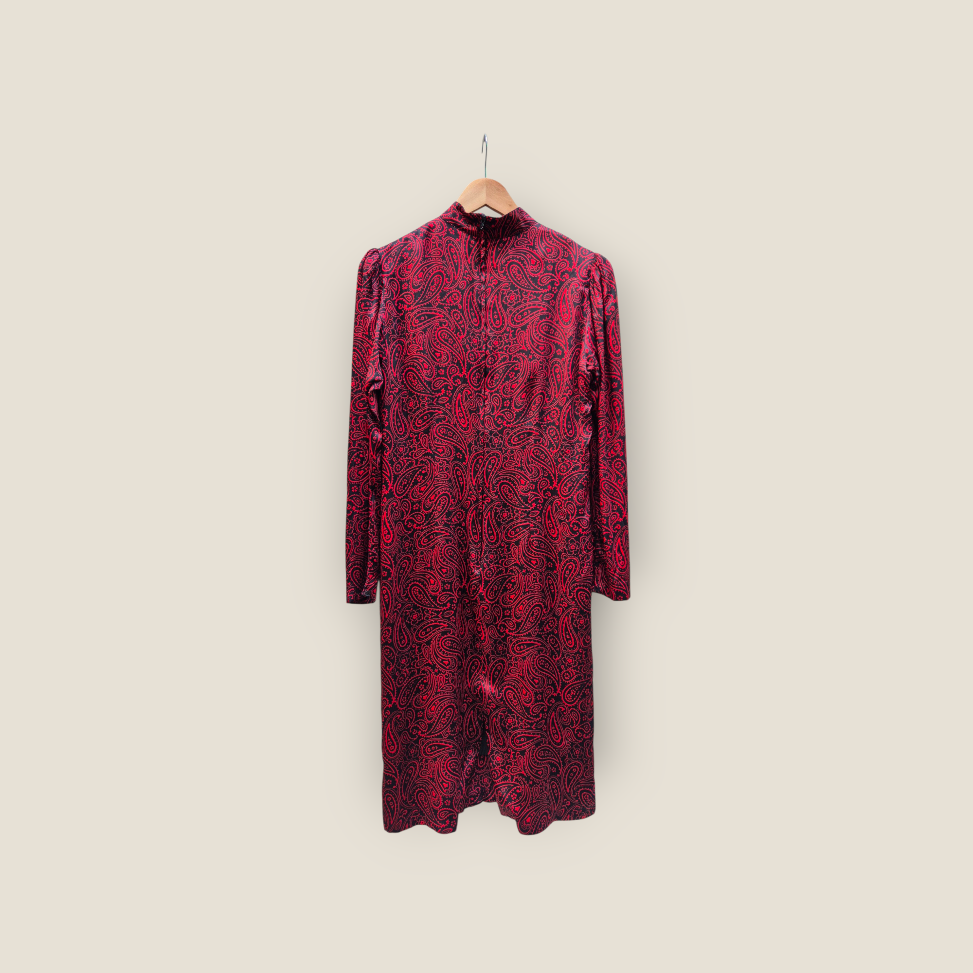Vestido Guy Laroche confeccionado en seda con llamativo estampado paisley en tonos rojo y negro. Presenta cuello alto ligeramente fruncido y manga larga con volumen suave en hombros, aportando estructura sin perder fluidez. La caída del tejido es ligera y elegante, con cintura definida que estiliza la silueta. Una pieza con carácter gráfico y sofisticado, ideal tanto para looks de día elevados como para ocasiones especiales.