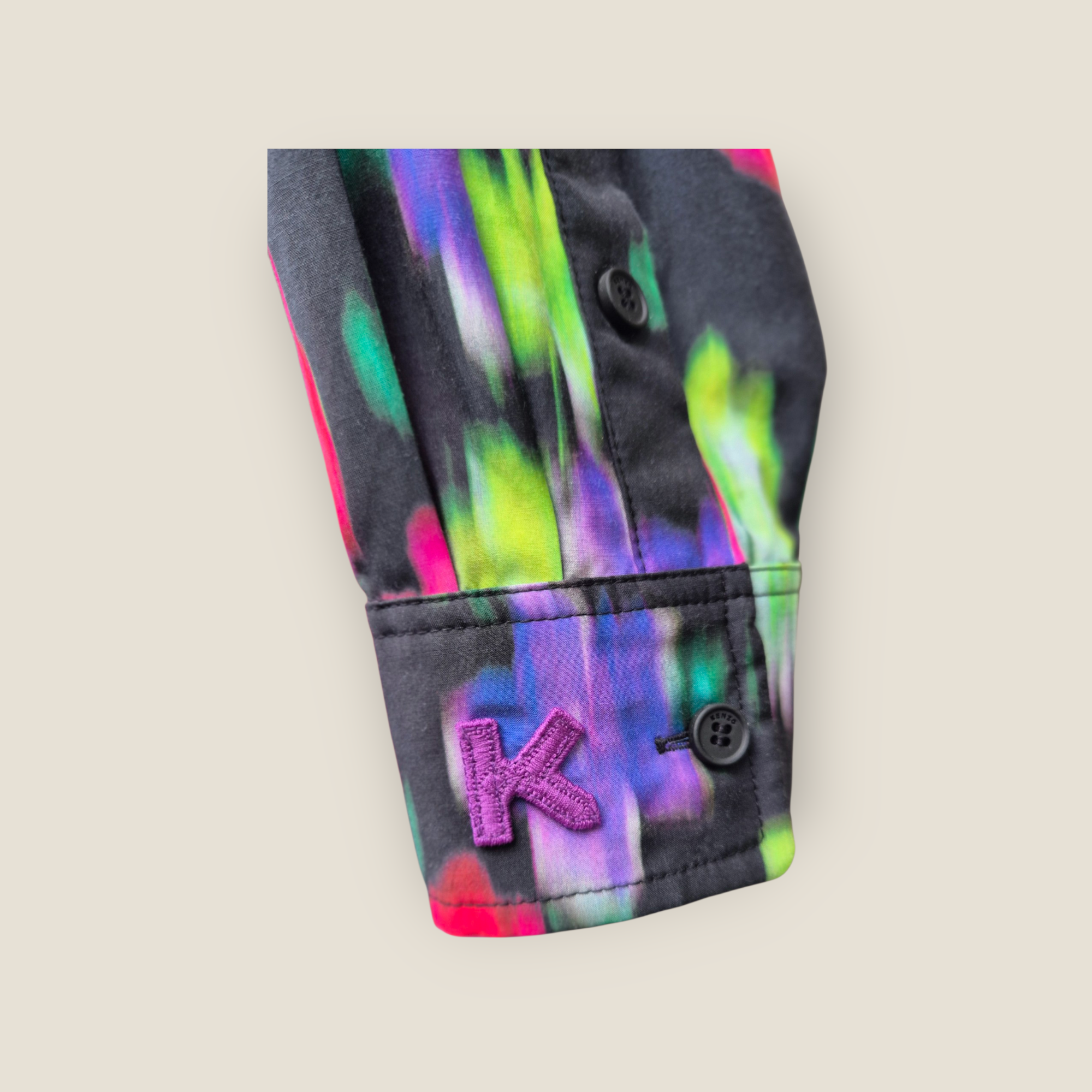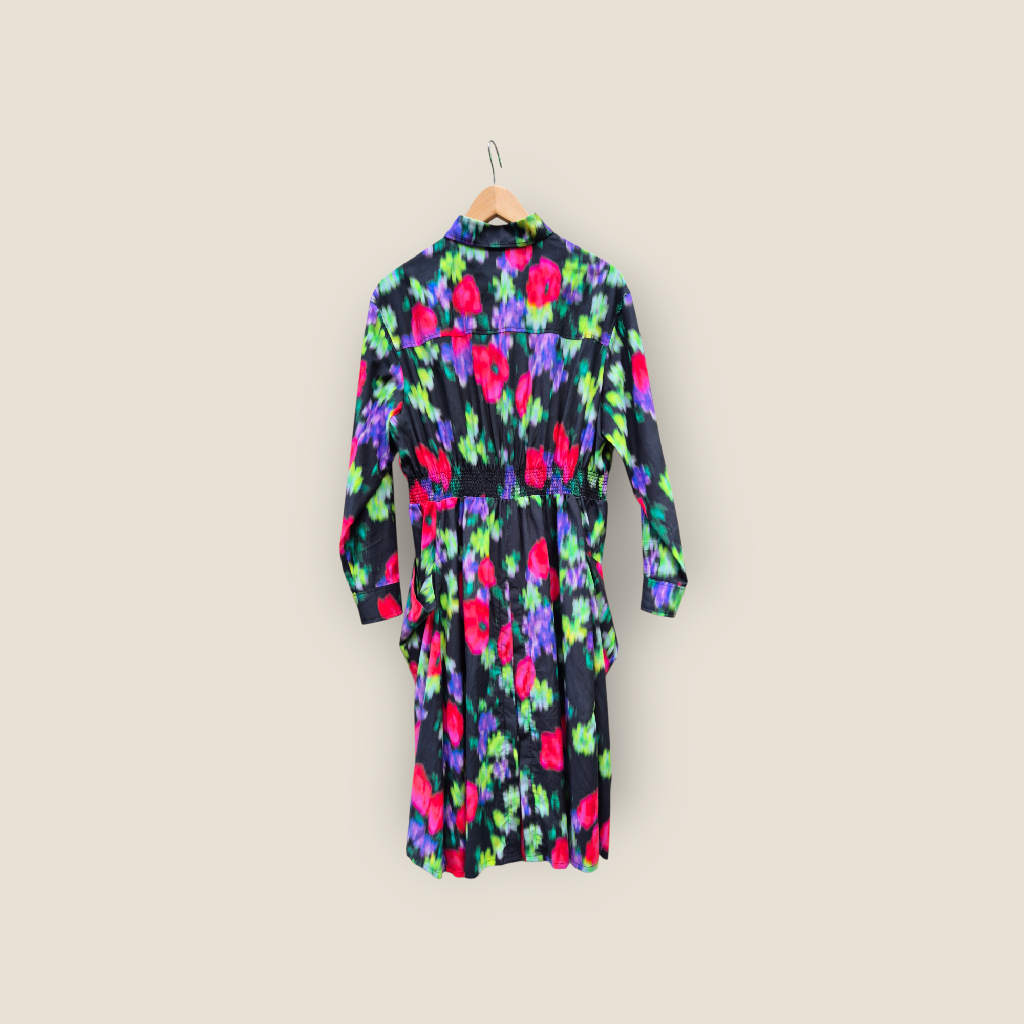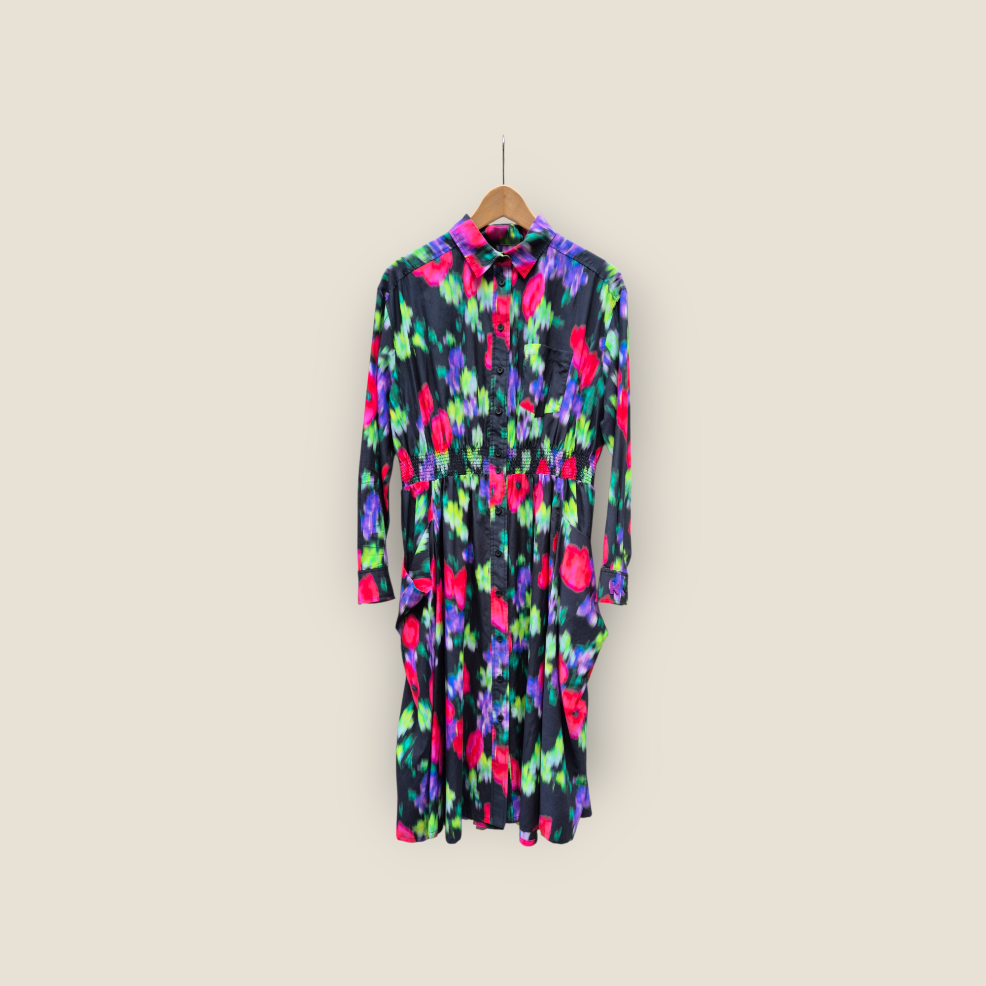 Vestido de la firma Kenzo confeccionado en mezcla de algodón y seda, con tejido ligero y tacto suave. Presenta estampado floral vibrante en tonos fucsia, verde y violeta sobre fondo oscuro. Diseño camisero con botonadura frontal completa, cuello clásico y manga larga con puño abotonado. La cintura fruncida aporta forma y caída fluida a la falda, creando una silueta femenina y cómoda. Ideal como pieza protagonista para entretiempo.