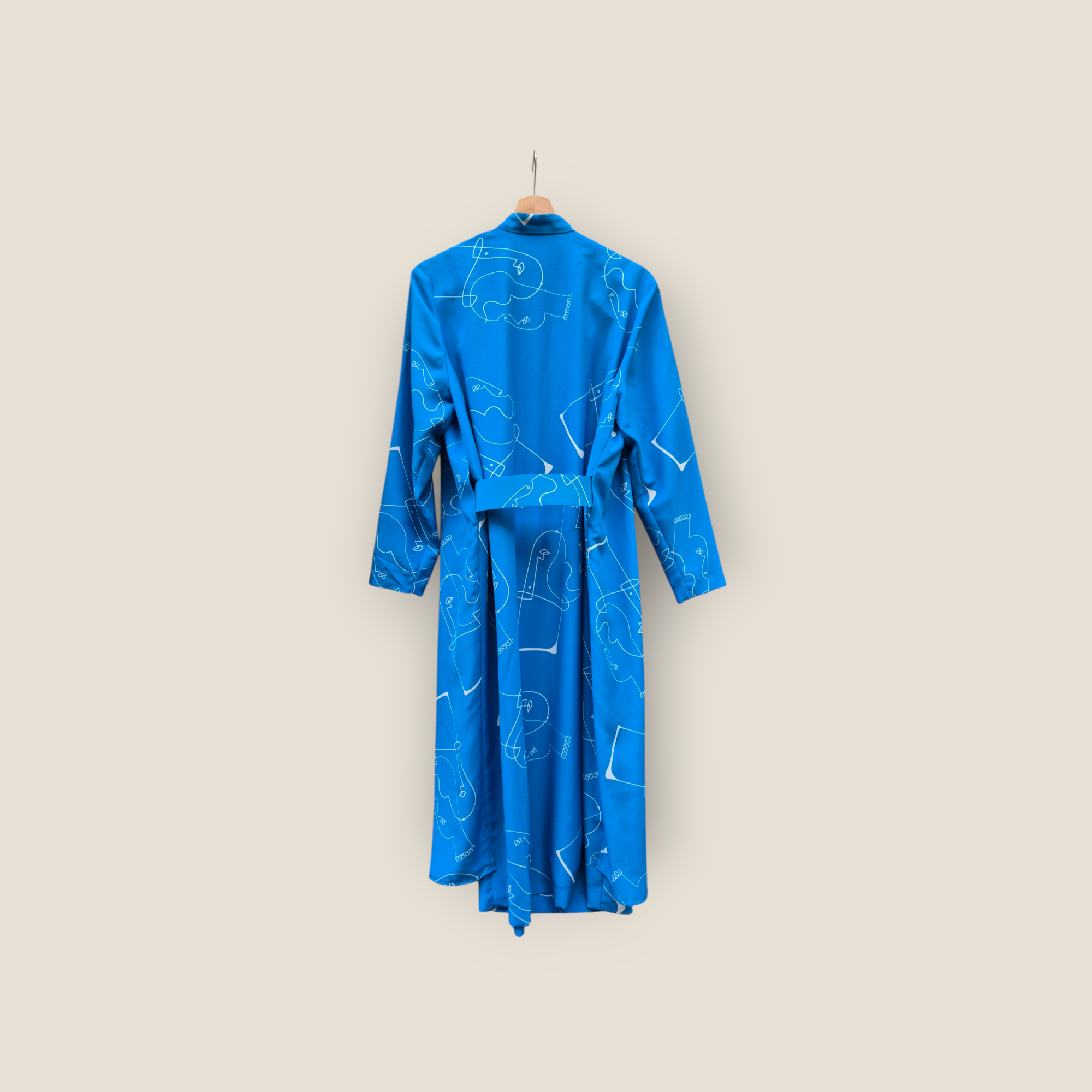 Vestido de la firma francesa Weill confeccionado en poliéster ligero, con caída fluida y estampado gráfico en contraste sobre fondo azul. Diseño de manga larga con cierre superior abotonado y cintura marcada mediante cinturón del mismo tejido. Largo midi y silueta favorecedora, ideal para uso diario elegante o look de oficina.
