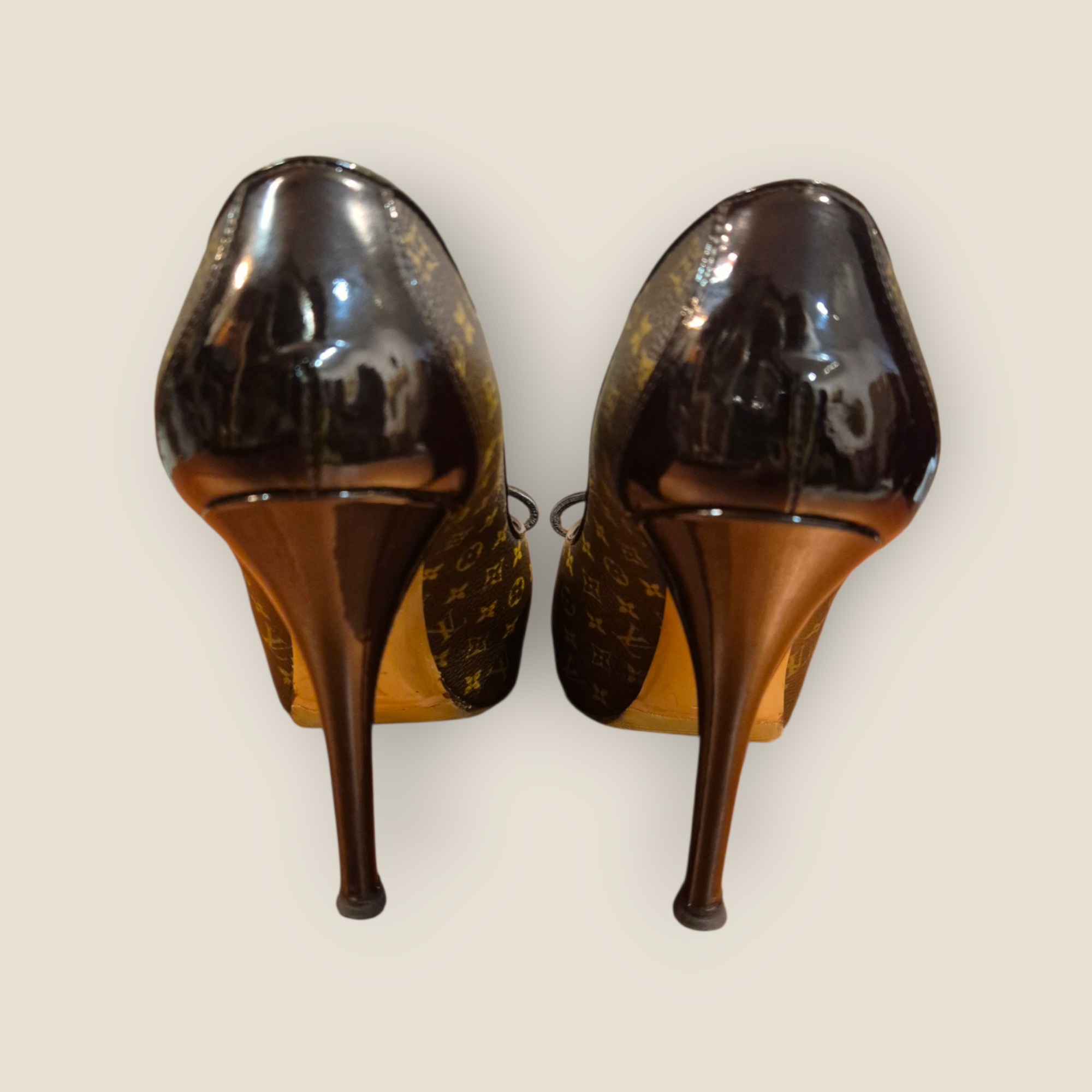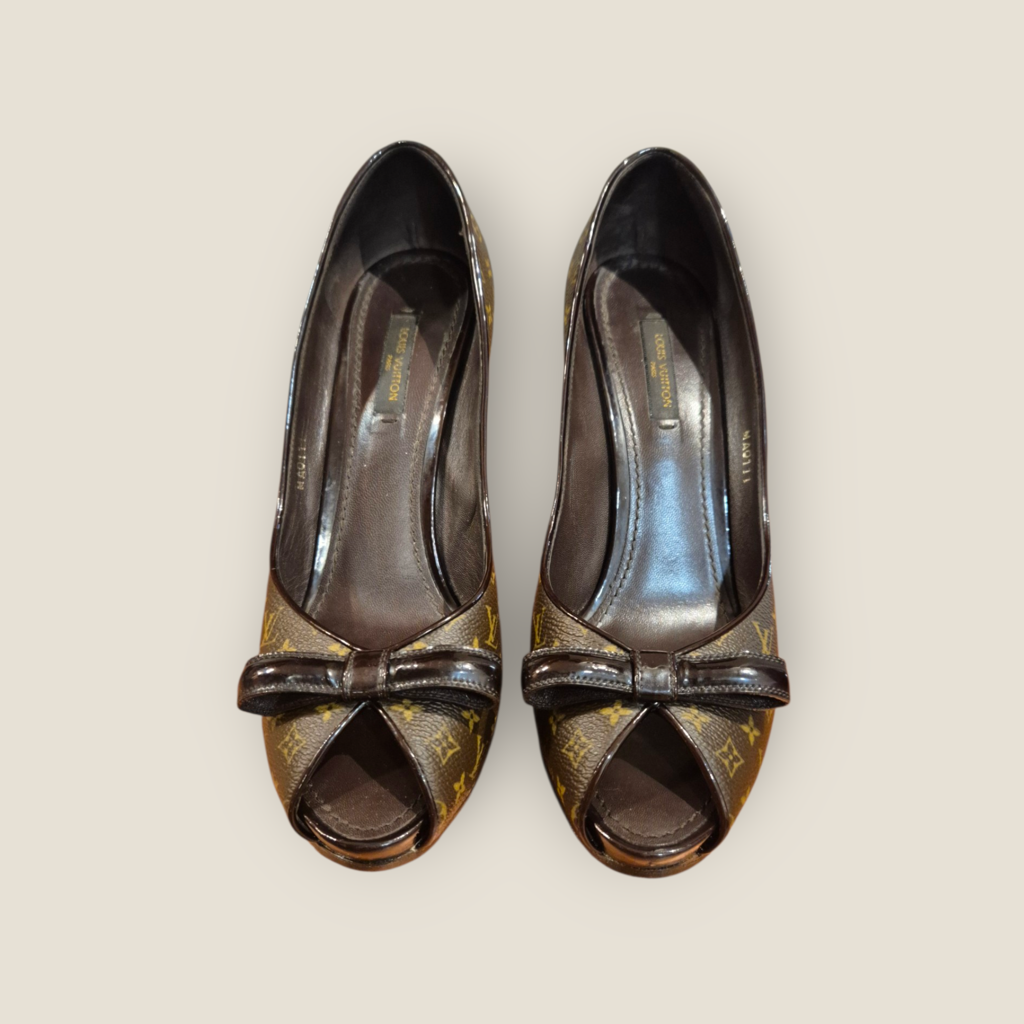 Zapatos de tacón Louis Vuitton confeccionados en lona Monogram con ribetes en piel barnizada marrón. Diseño femenino con apertura peep toe y lazo decorativo en la parte frontal que aporta un acabado elegante y reconocible. Incorporan zuela antideslizante, plataforma interior y tacón alto fino que estiliza la silueta. Interior en piel para mayor comodidad. Un modelo icónico para combinar con looks de noche o conjuntos sofisticados de día.